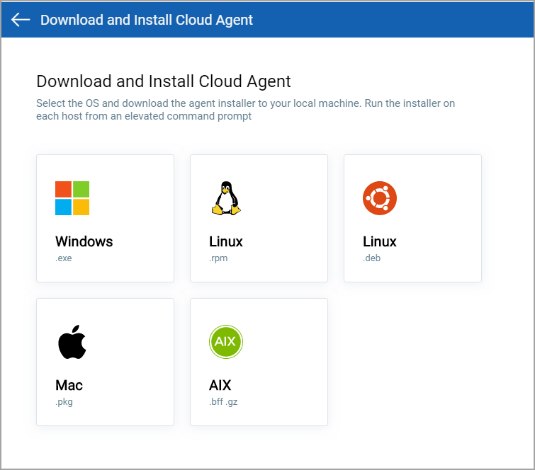 Select an OS and download the agent installer to your local machine. Run the installer on each host from an elevated command prompt.