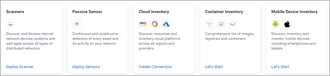 You can build your inventory for on-prem (devices and applications), mobile, endpoints, clouds, containers, OT and IoT assets using scanners, sensors, or connectors.