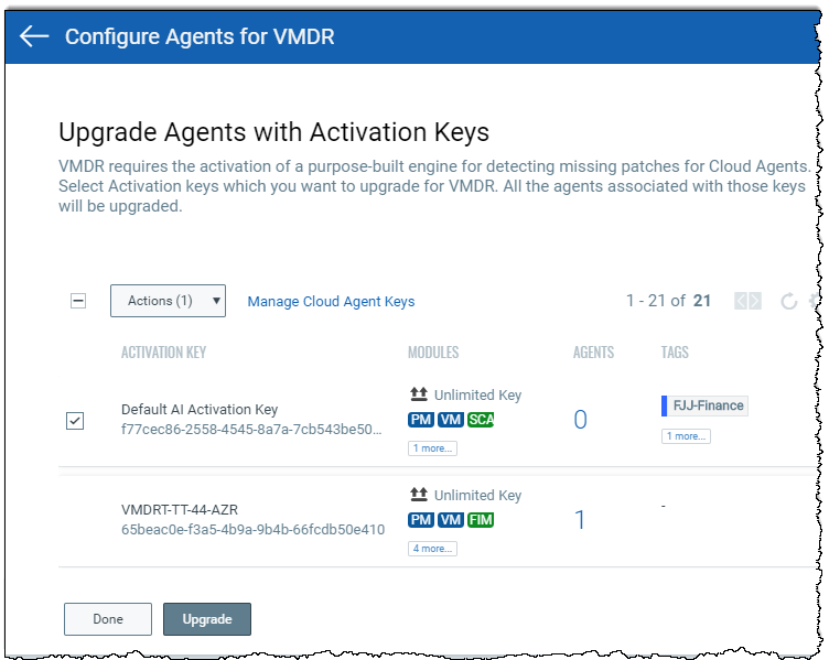 Select the desired activation keys and click Upgrade. The selected activation keys will be upgraded for VMDR.