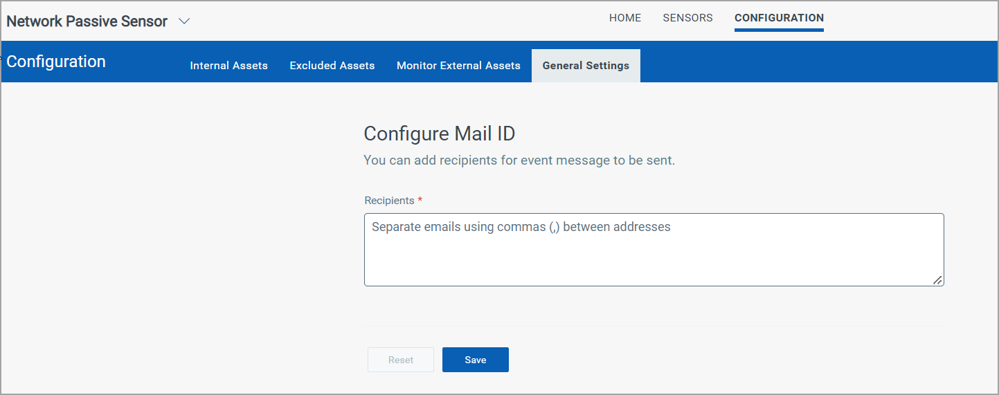 Navigate to Configuration > General Settings and go to the recipient’s text box and add the e-mail or you can add multiple e-mails using comma separated. Click Save.
