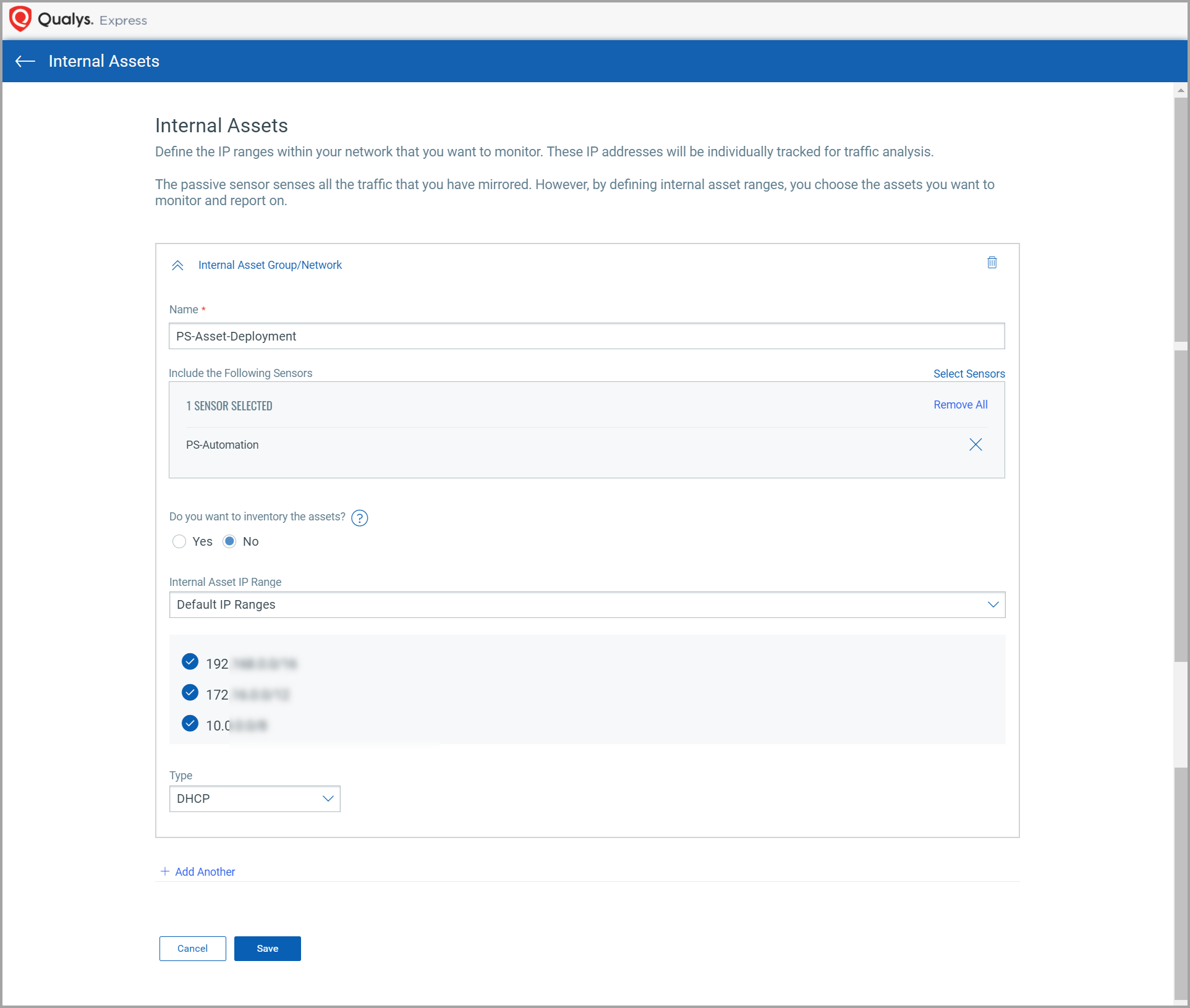 While registering a sensor, in Define Internal Assets step, you can add IP ranges within your network to monitor. The assets discovered for these IP addresses will be individually inventoried and tracked for traffic analysis. You'll be able to select IP ranges from default list or can create custom IP ranges.
