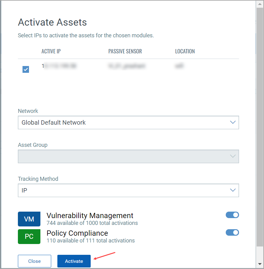 Now you can add IP addresses of un-managed assets into an IP range which can be scanned for VM and PC. The scans themselves have to be triggered via the respective VM or PC modules. You can choose one or more assets whose active IP (by default) is selected. You may then choose to add the selected IP(s) or IP of a different interface to be activated for scan. If your account has Network subscription, then you can choose from a list of Networks that the user has admin rights to, for adding the IPs. While adding a single IP, the Network associated with the sensor appliance that reported the asset, is chosen as the default network to add the IP to.