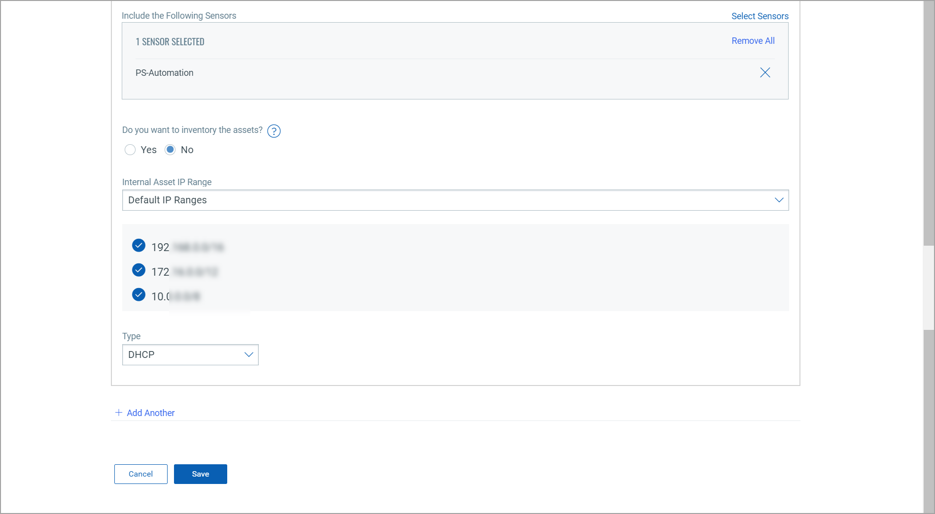 Here, you’ll define the IP ranges within your network you want to monitor. The assets discovered for these IP addresses will be individually inventoried and tracked for traffic analysis. You can use default IP ranges, IP range tags, or customized IP ranges options to define range of internal assets. Select Do you want to inventory the assets check box for marking inventoried assets.